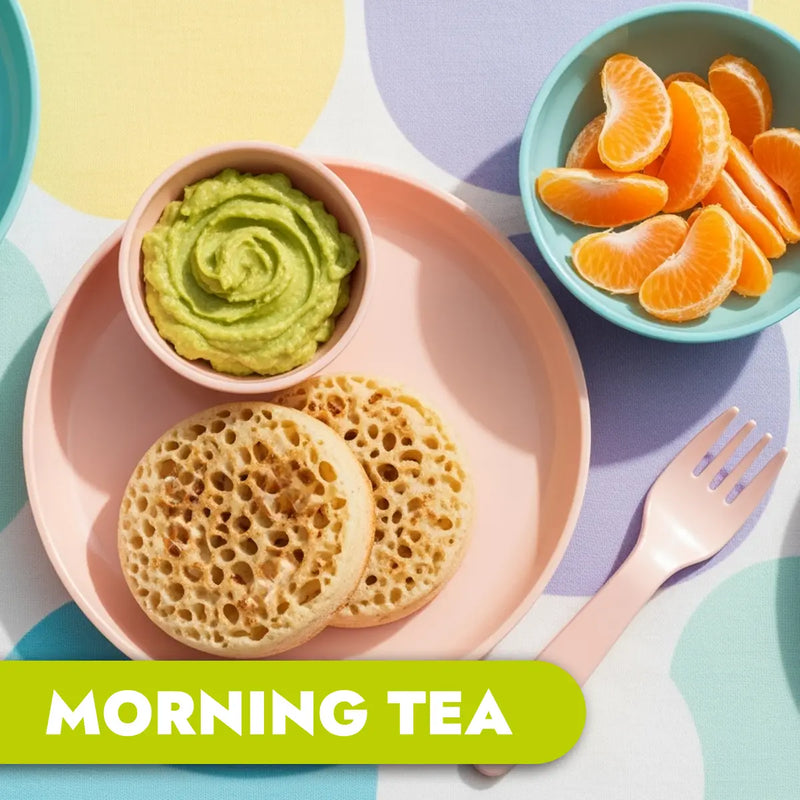Wholemeal crumpets, avocado spread & seasonal sliced fruit