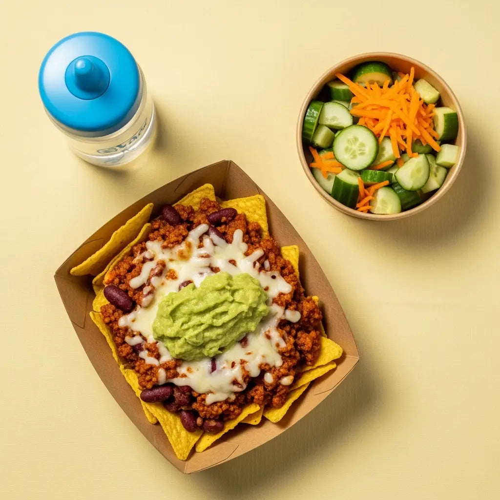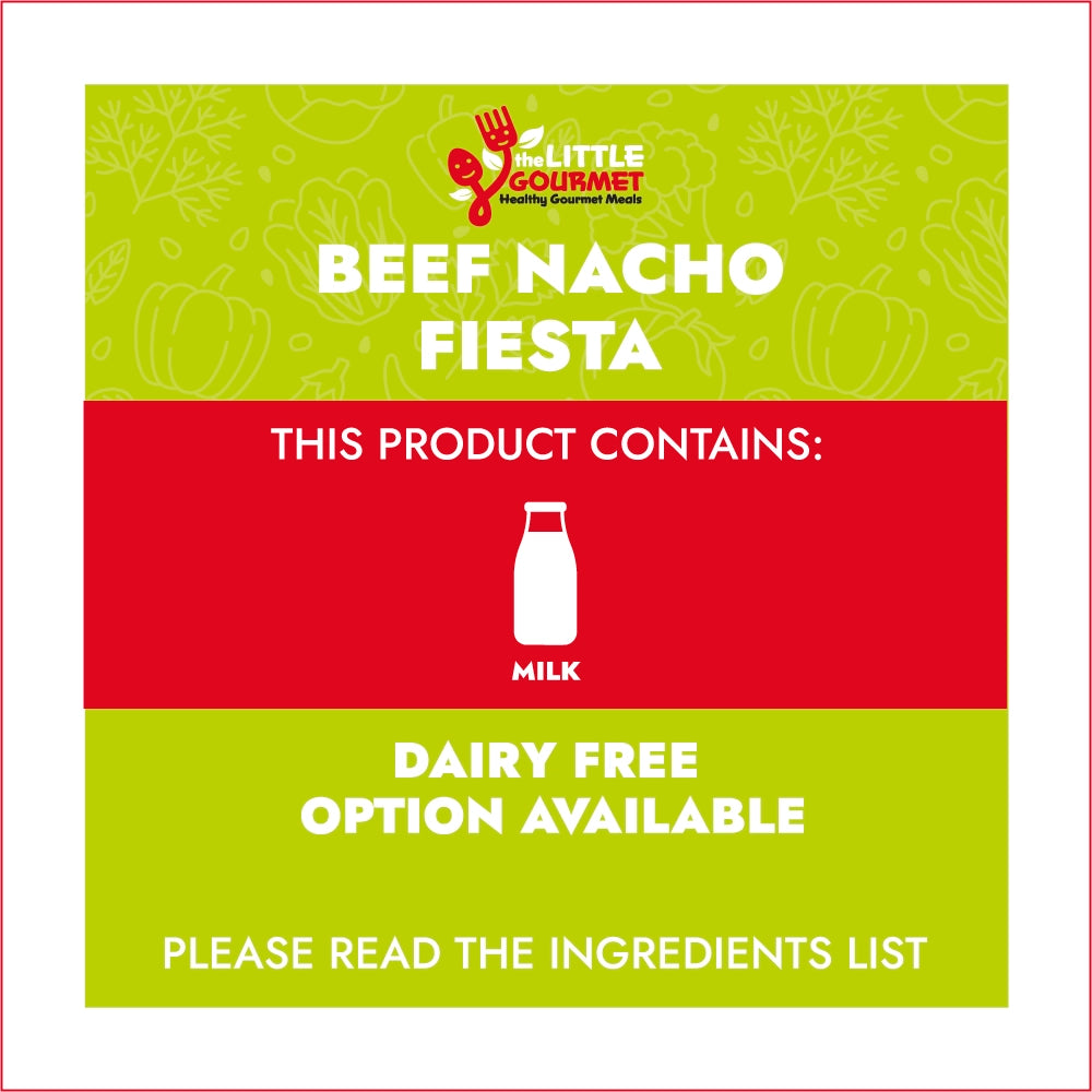 Lean beef mince, Onion, Garlic, Tomato passata, Red kidney beans (optional), Corn chips, Grated cheese (Dairy Free avail.), Olive oil (for cooking), Cucumber (diced for side), Carrot (grated for side), Dried cumin + mild paprika.
