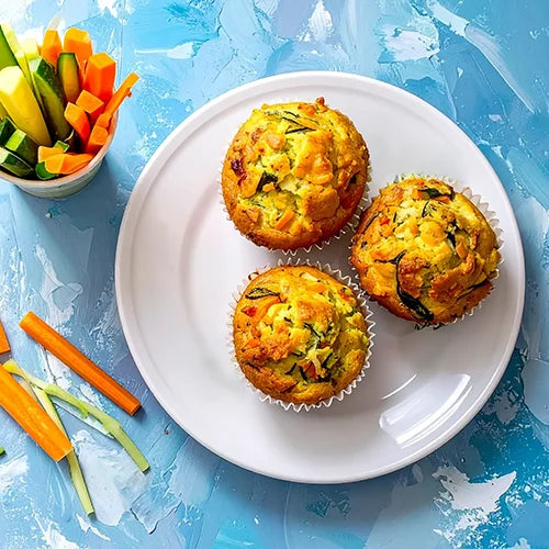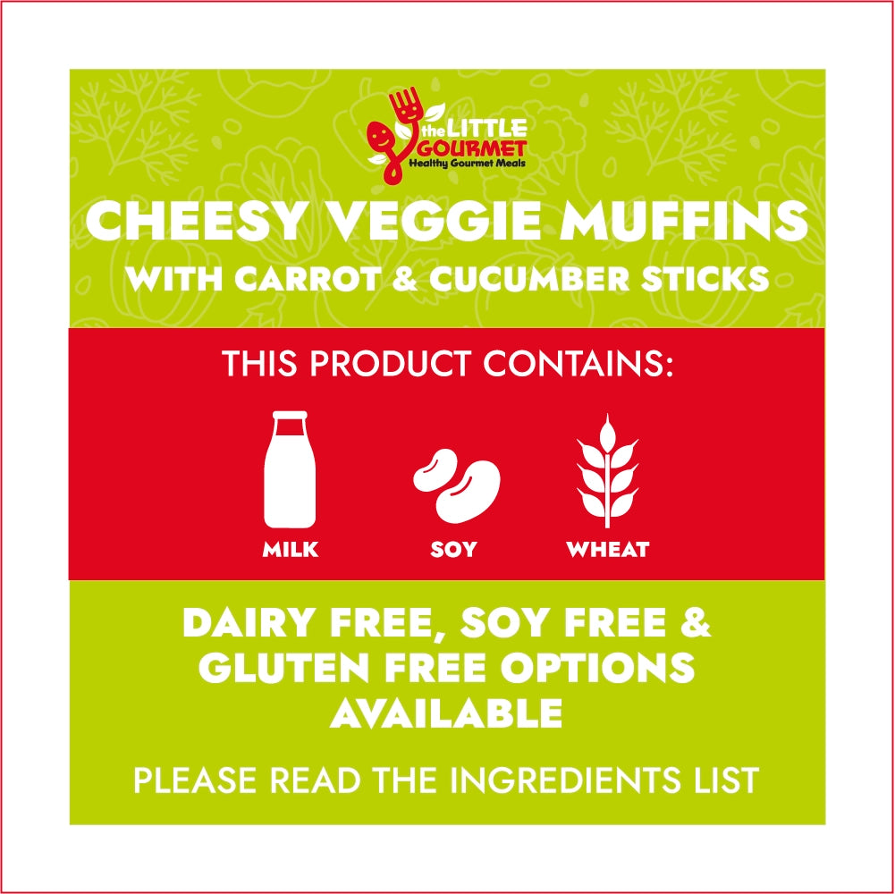 Muffin: Self-raising flour (GF avail.), Baking powder, Milk (DF avail.), *Egg replacer, *Shredded cheese (DF avail.), Olive oil, Zucchini, Carrot, Salt & dried herbs, Veggie Sticks: Carrot, Cucumber.
