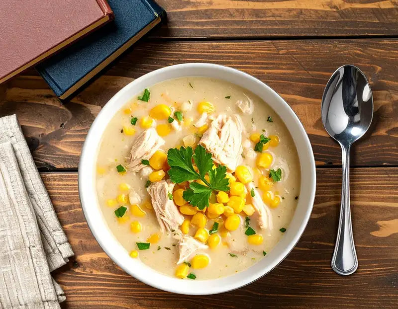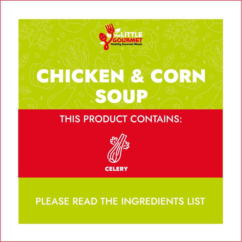 Chicken breast (poached), Sweet corn kernels, Onion, Garlic, *Vegetable stock (low sodium), Olive oil, Cornflour, Salt & pepper. Fresh parsley (optional garnish).