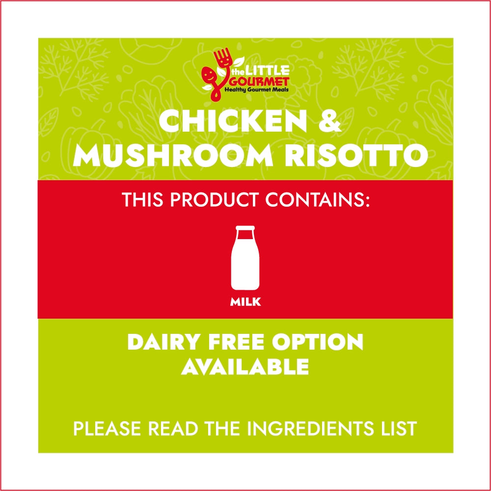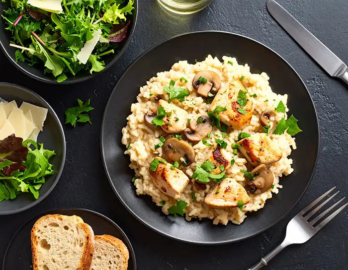 Chicken breast, Arborio rice, Mushrooms, Onion, Garlic, Chicken tock (low sodium), Olive oil, Parmesan cheese (Dairy Free avail.), Fresh parsley, Salt & pepper.