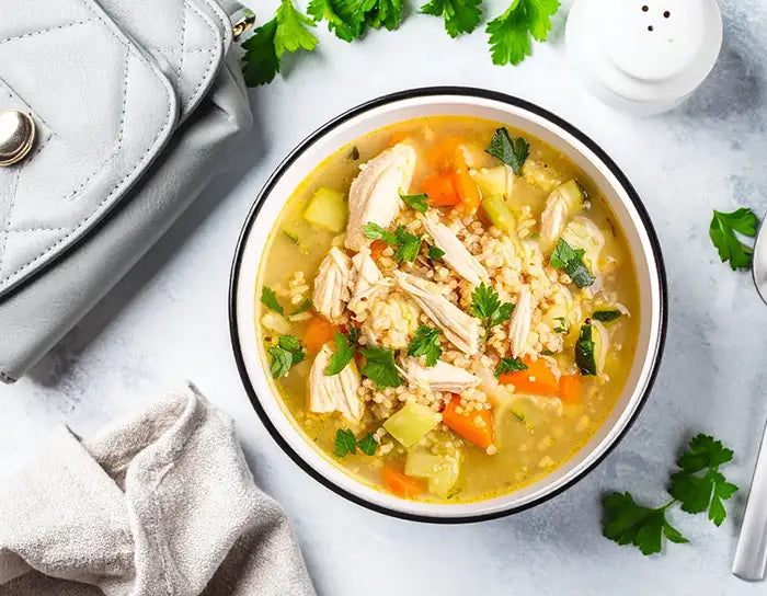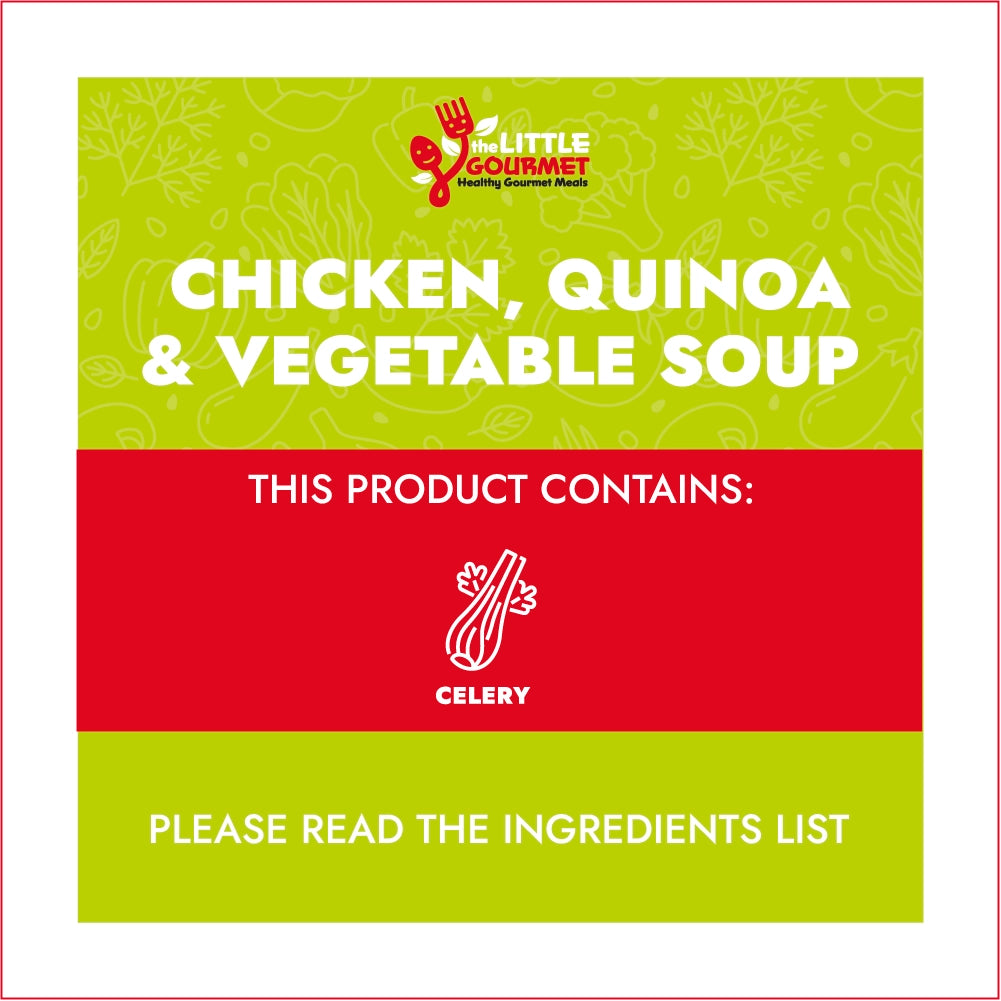 Chicken breast (poached), Quinoa, Carrot, Zucchini, Celery, Onion, Garlic, Olive oil, *Chicken stock (low sodium), Bay leaf, Salt & pepper, Fresh parsley (garnish).