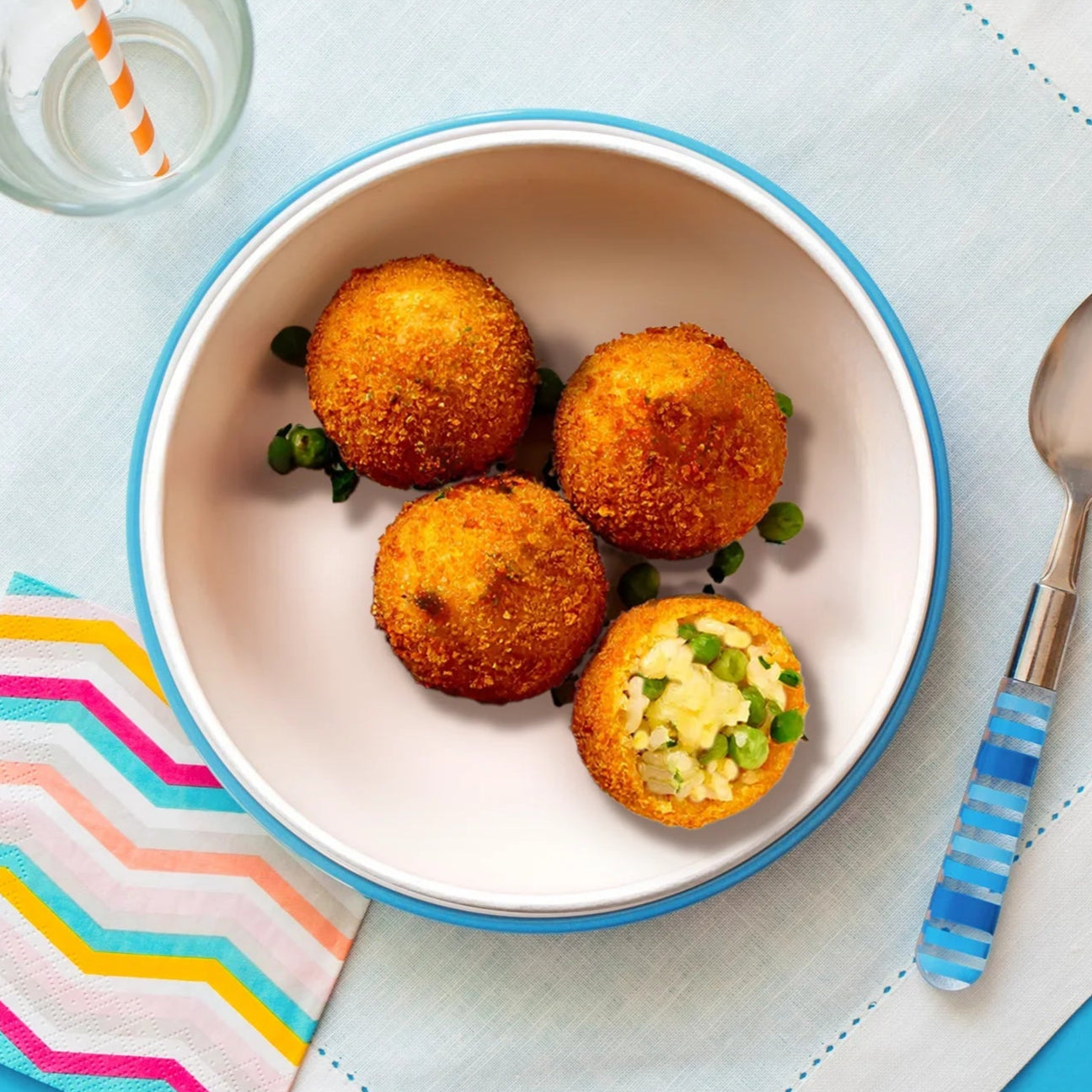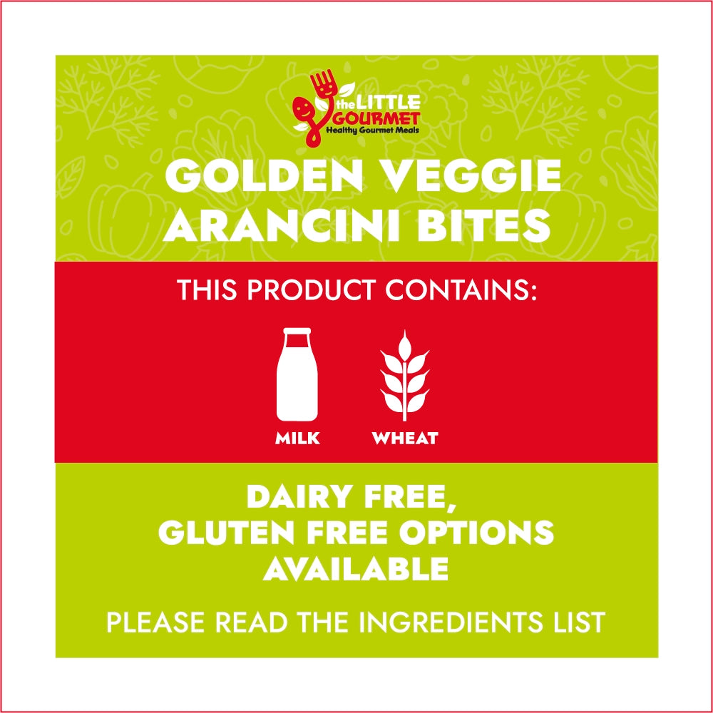 Arborio rice, *Mozzarella cheese (DF avail.), *Parmesan cheese (DF avail.), Peas, Fresh parsley, *Breadcrumbs (GF avail.), Olive oil.