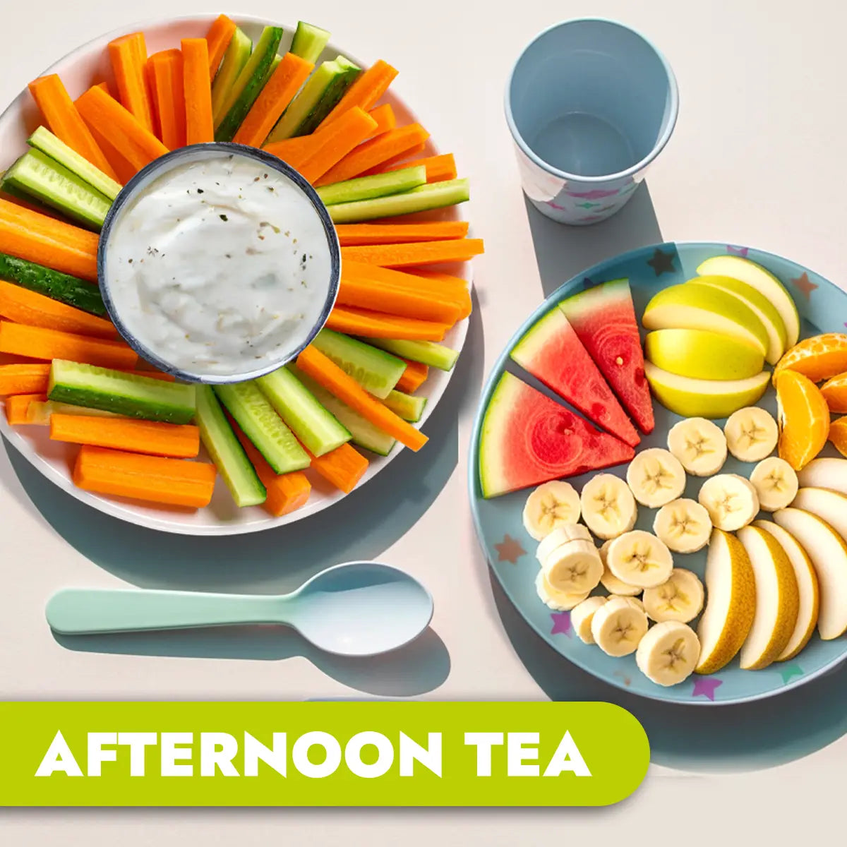 Vegetable sticks with yoghurt & herb dip & fresh, seasonal fruit platter.