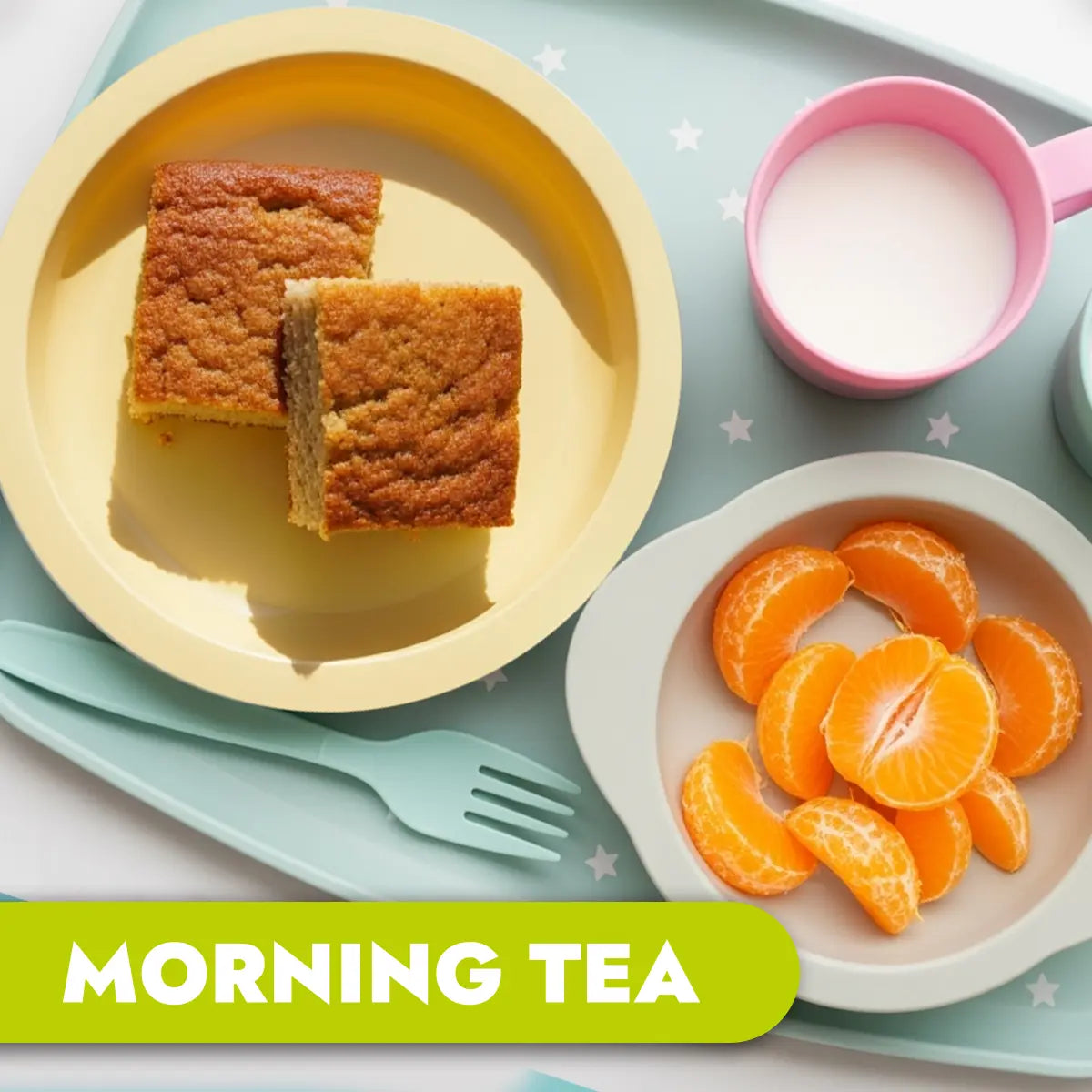 Wholemeal banana cake slice & fresh seasonal sliced fruit.