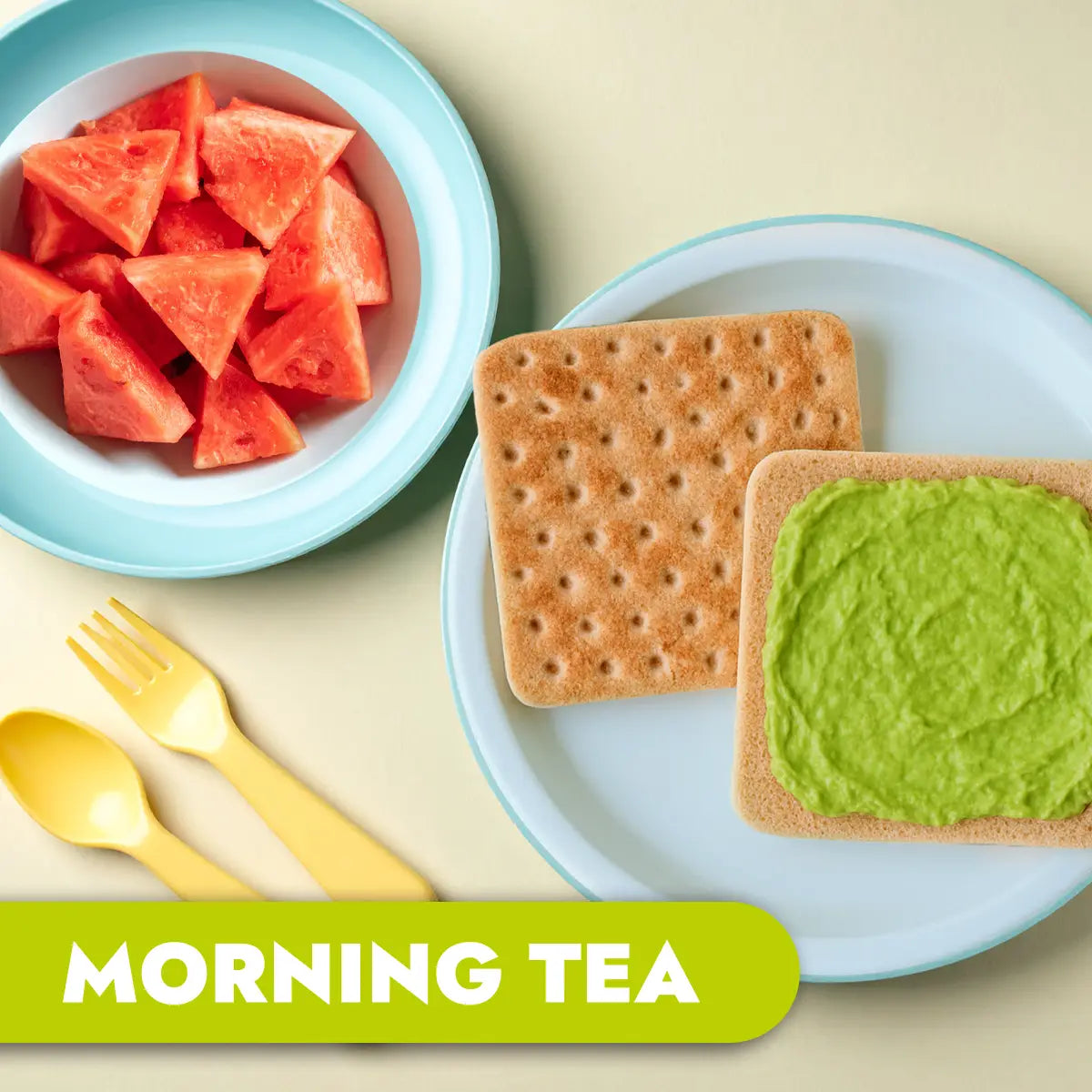 Wholemeal thins with avocado spread & sliced, seasonal fresh fruit.
