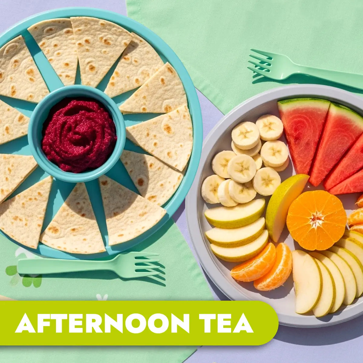 Beetroot dip with wholemeal tortilla triangles & fruit platter