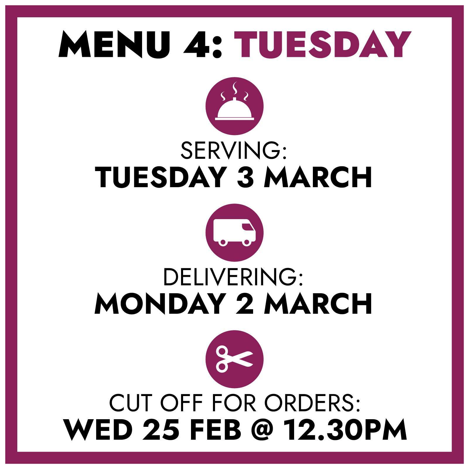 Note: All age groups are served age appropriate variations of the daily menu, including purees and softer foods.