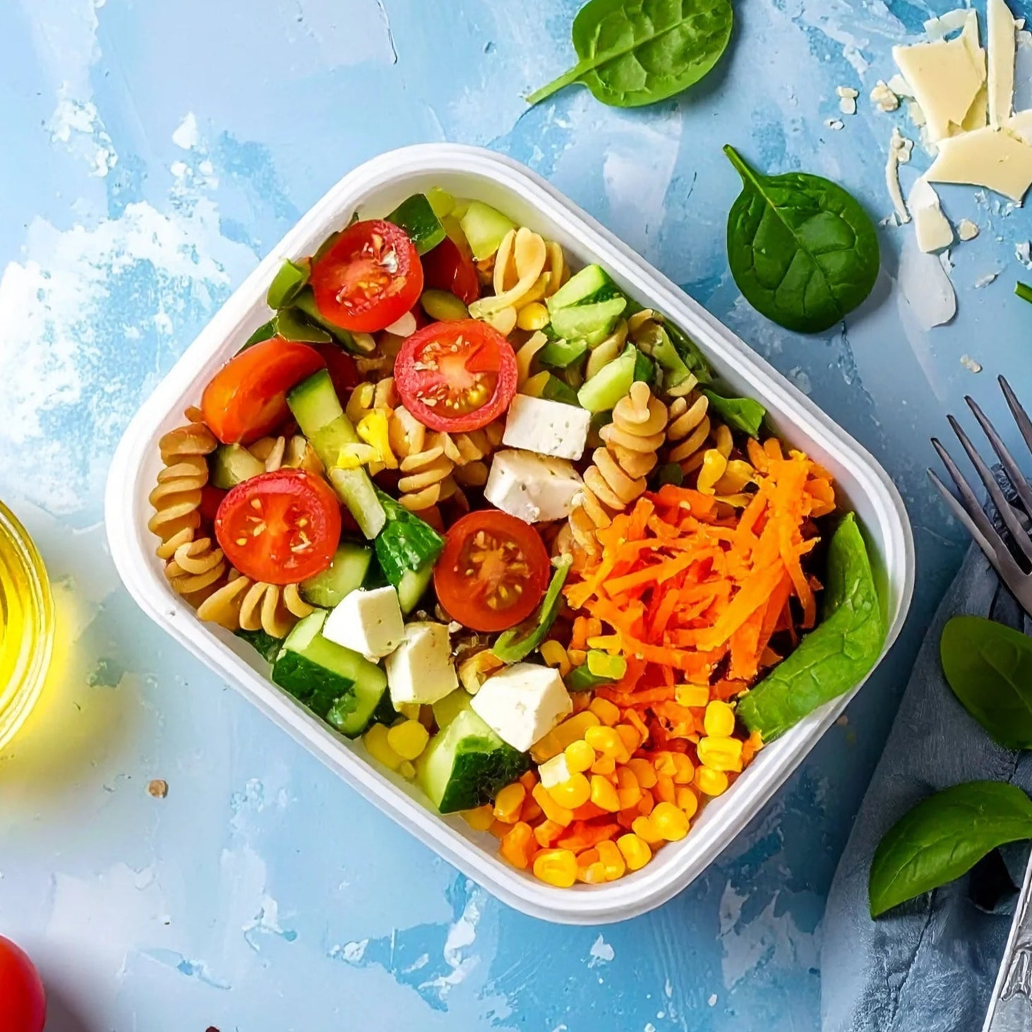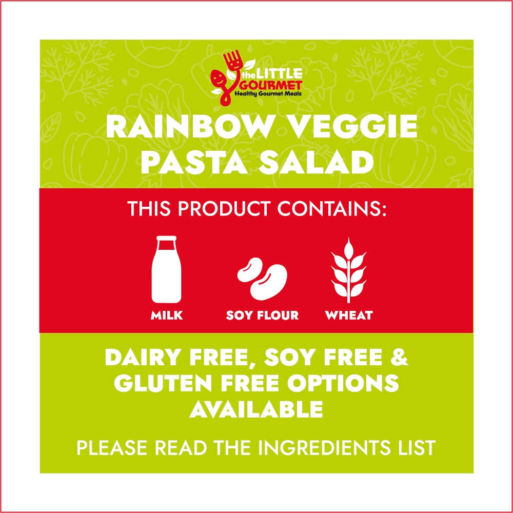 *Wholemeal spiral pasta (GF available), Cherry tomatoes, Cucumber, Carrot, Corn kernels, *Mild cheese (DF available), Olive oil, Lemon juice, Honey, Salt, Baby spinach (optional).